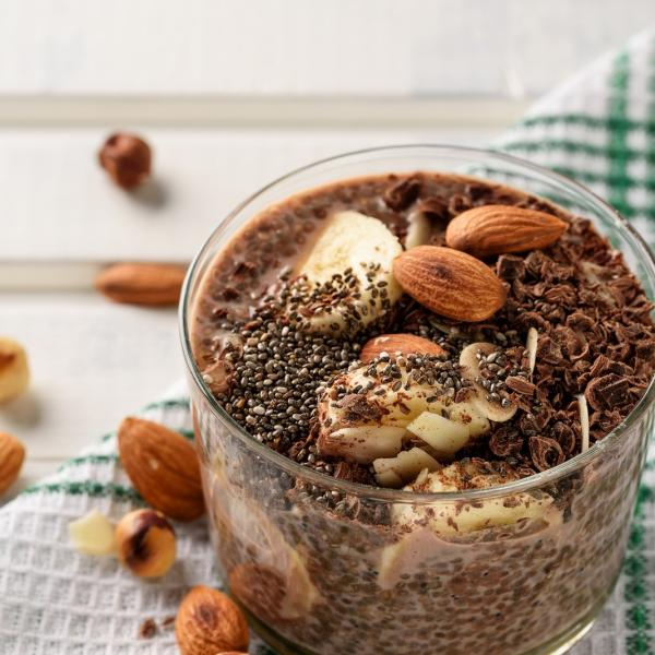 A delicious and healthy breakfast with this banana chia pudding, almonds, hazelnuts & cocoa. This pudding can also be enjoyed as a light dessert. Best prepared the day before.
