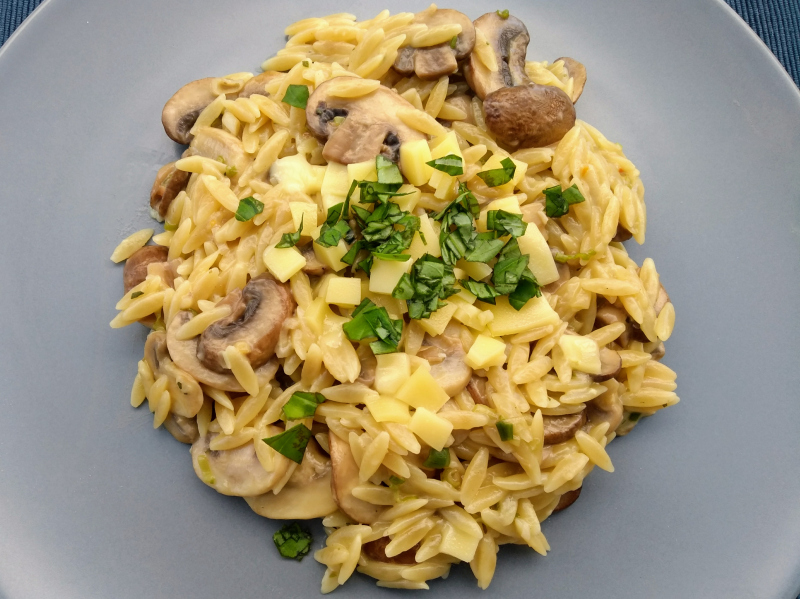 7. Add the mushrooms, spring onions, and half of the cheese to the barley and let them melt while stirring.