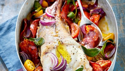 Discover how to make a recipe for baked monkfish tail with chorizo, onions, and tomatoes by following the simple steps of our preparation. A delicious surf and turf-inspired dish that will please everyone!