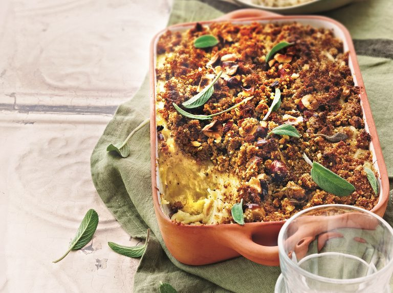 4. Preheat the oven to 220°C (425°F). Prepare the sage breadcrumb topping. In a food processor, chop the sage with the softened butter, breadcrumbs, crushed hazelnuts, 1 peeled and germ-free garlic clove, salt, and pepper.