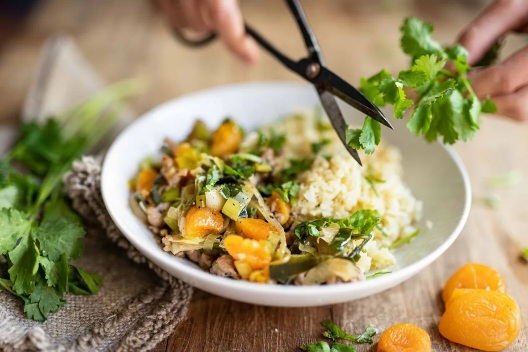 5. Serve the pork stew with dried apricots sprinkled with coriander.