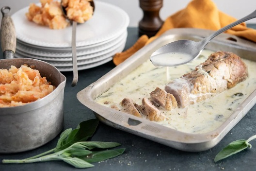 3. The pork tenderloin: In a Dutch oven, heat a drizzle of cooking oil over medium-high heat. Season the pork tenderloin well with salt and pepper. Cut it in half if it doesn't fit entirely in the Dutch oven. When the oil is hot, sear the pork tenderloin for 2 to 3 minutes on each side until golden brown. Then add the milk and sage, bring to a boil, and simmer uncovered for 20 minutes. Season with salt and pepper. Peel the garlic whole with the skin on or chop it. Add it to the milk. Remove the Dutch oven from the heat and let the pork tenderloin cool slightly before removing it from the milk. Use the milk to make the mashed potatoes creamier.