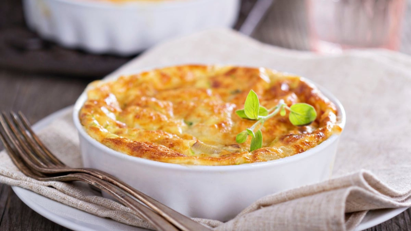 3. Beat the eggs in a bowl, add the cream, season, grate the nutmeg. Add the cheese, ham, and mix.