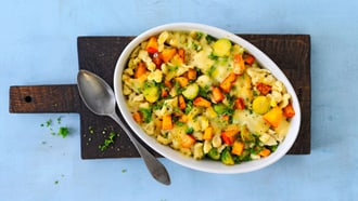 2. Heat the butter in a large skillet and sauté the spätzli with the onion, squash, and Brussels sprouts for about 5 minutes. Season with nutmeg, salt, and pepper.