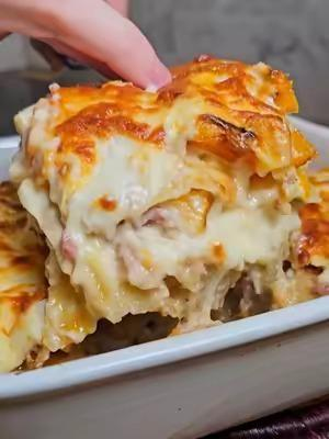 7. Place a little béchamel in the bottom of the dish, a layer of pasta, a little butter, the bacon, then pasta, béchamel, and so on. Finish with a layer of béchamel and a sprinkle of grated cheese on top.