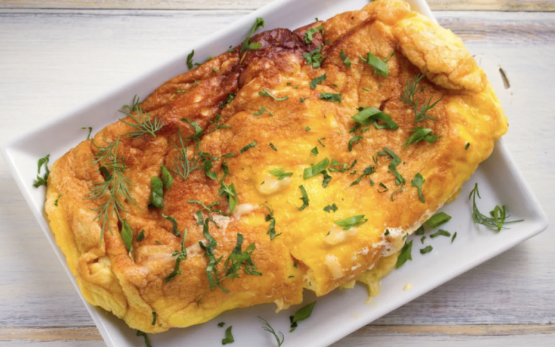 6. Cook over low heat until the omelette is set on the edges, but still slightly runny in the center.