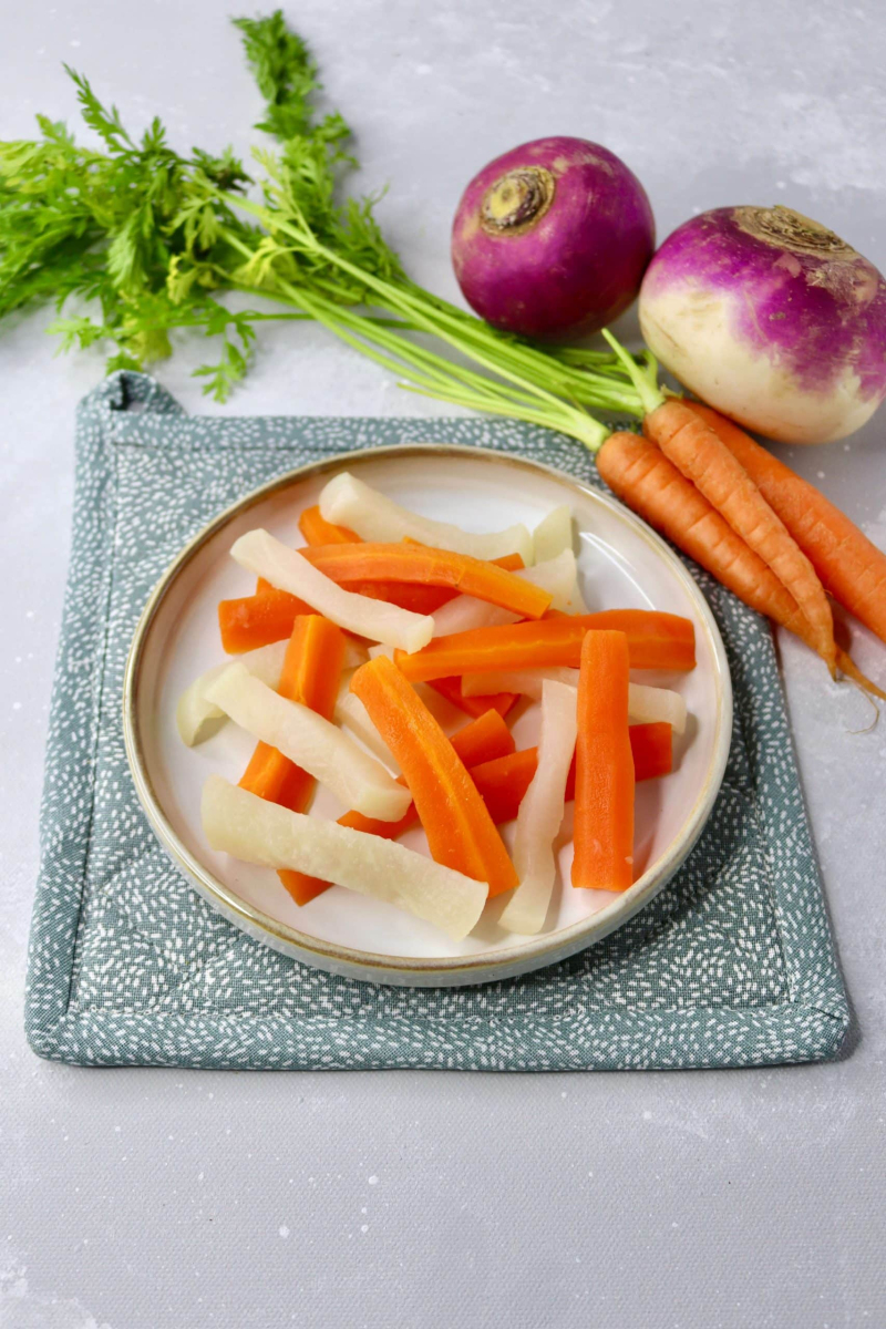 1. Start by peeling the carrots and turnips, then cut them into similar-sized pieces for even cooking.