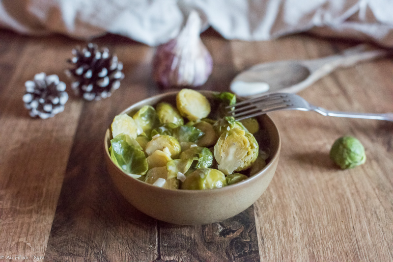 Serve these Brussels sprouts with garlic cream hot. They go well with a pork tenderloin or any pork meat.