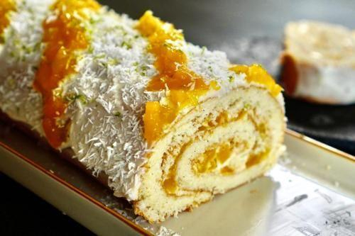 11. Spread a thin layer of cream over the entire sponge cake (save some for decoration), then place the cooled mango on top, roll the log, and decorate it!