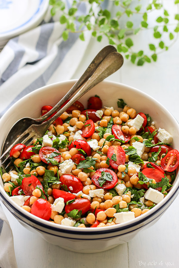 9. Add the drained chickpeas, cut tomatoes, feta cubes, and chopped parsley.