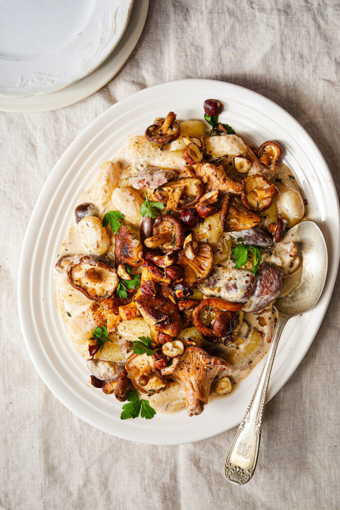 4. When serving, garnish with the reserved mushrooms, parsley, and roasted hazelnuts.