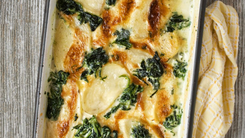 4. In a buttered dish, layer alternately with a layer of potatoes, a layer of spinach, and a layer of grated Gruyère cheese, salt, and pepper. Finish with a layer of potatoes, sprinkle with thyme.