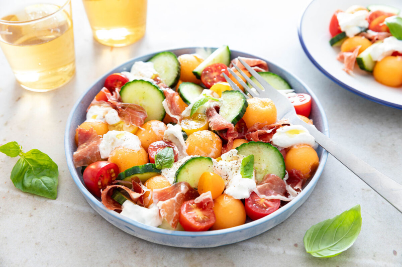 Here is a very simple recipe to make, without cooking, and so delicious! This delicious freshness salad, with melon, tomato, cucumber, and burrata, is the essential recipe to face hot days with indulgence. Combining the sweet softness of melon with creamy burrata, this salad is an explosion of freshness and summer flavors. Easy to prepare and ultra-refreshing, it is perfect for a light lunch or a dinner on the terrace. Let yourself be tempted by this recipe that will bring a touch of freshness and pleasure to your sunny days! Culinary styling: Zoé Agnus-Bogé