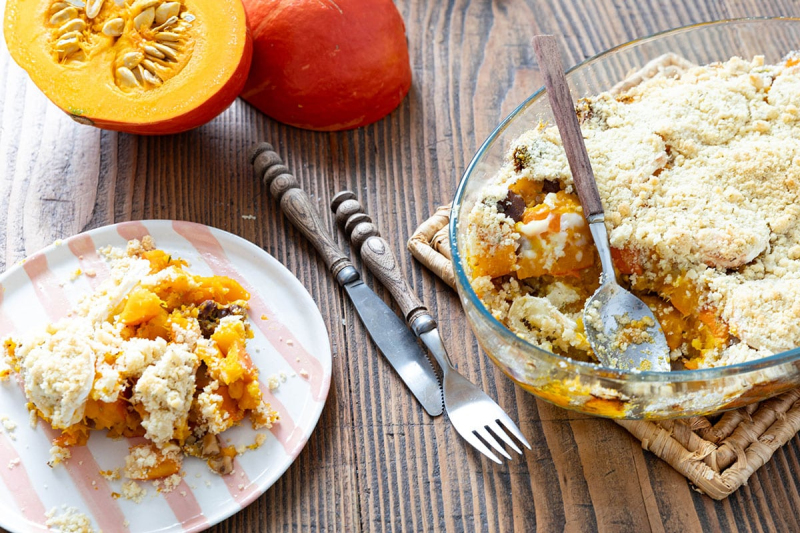 The pumpkin, chestnut, and goat cheese crumble is an autumnal delight to share with family. Its golden and crispy crust reveals a melting and flavorful mixture, where the sweetness of the pumpkin blends with the richness of the chestnuts and the creaminess of the goat cheese. Placed in the center of the table, this generous dish invites everyone to serve themselves, creating a warm and convivial atmosphere.