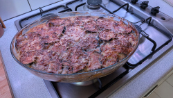 6. Grease a baking dish and line the bottom with half of the eggplants. Cover with the meat and tomato mixture. Finish with a layer of eggplants.